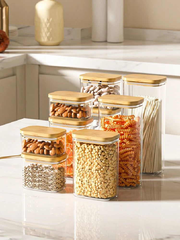 Keep your pantry organized and accessible with these versatile clear storage containers featuring natural bamboo lids. The transparent design lets you see contents at a glance, while the airtight seals preserve freshness for dry goods and pantry staples. Mix and match multiple sizes to create a customized storage solution for any cabinet or shelf configuration. The durable containers withstand daily family-friendly use, and the eco-friendly bamboo lids add a refined touch to your kitchen aesthetic.
